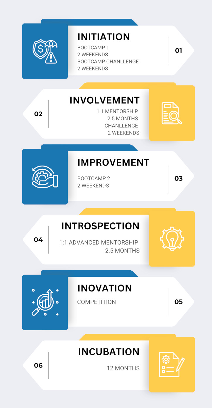 - Projects mentored and fine-tuned over 7-8 months with expert guidance followed by incubation support.